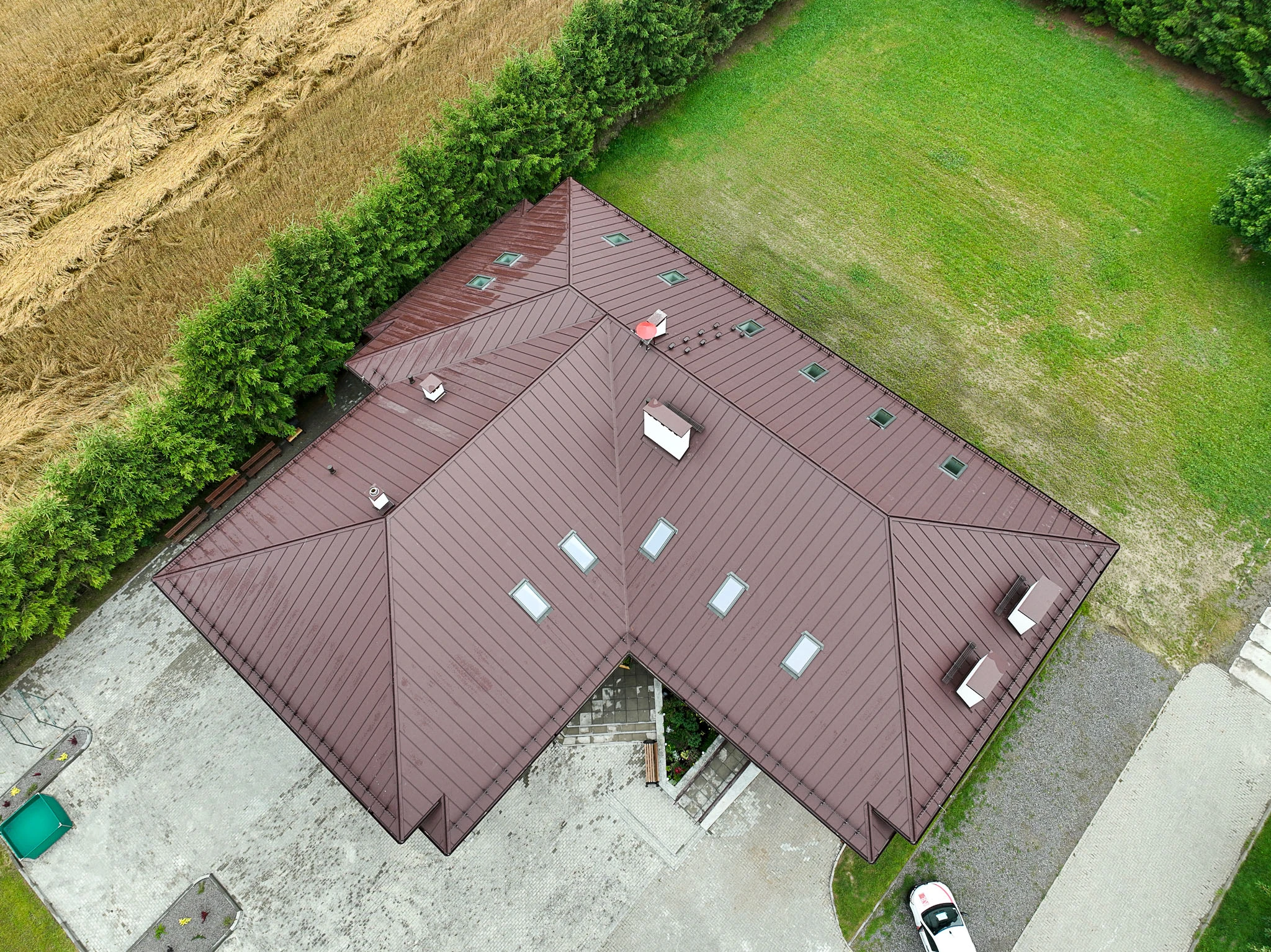 Panel dachowy posiada Podwinięcie początku krawędzi pod pas nadrynnowy i wycięcie arkusza pod gąsior oraz zaślepkę na łączeniu arkuszy która maskuję profil panelu.